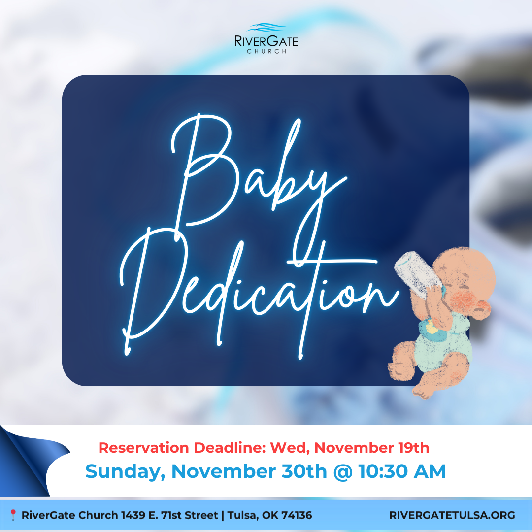 We will have a baby dedication on Sunday, November 30th during the 10:30am service. If you would like to formally dedicate your child, please reserve your spot by contacting John Hemby at pastors.assistant@rivergatetulsa.org. Reservation deadline is Wednesday, November 19th.