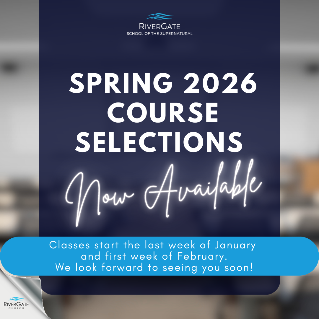 Course selection and enrollment for the 2025 Spring Semester for the RiverGate School of the Supernatural is now available. Be sure to visit our website for more information or stop by the RGSS kiosk in the hallway or the Enrollment Center. Classes start late January and early February.